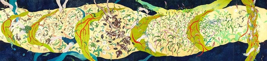 中でもメインとなる八曲一隻(幅約7.2メートル高さ1.8メートル)の屏風は、栗原市栗駒文字地区の山間の集落に平安時代から変わらぬ手順で受け継がれて来た「正藍冷染」と、技術を守り続け現在は唯一の藍農家となった千葉家の人々との交流から生まれた大作です。親から子へ、手から手へと渡されてきた「藍の種」、一反の布の背景に隠れた膨大な個人の物語を鮮やかに表現しています。