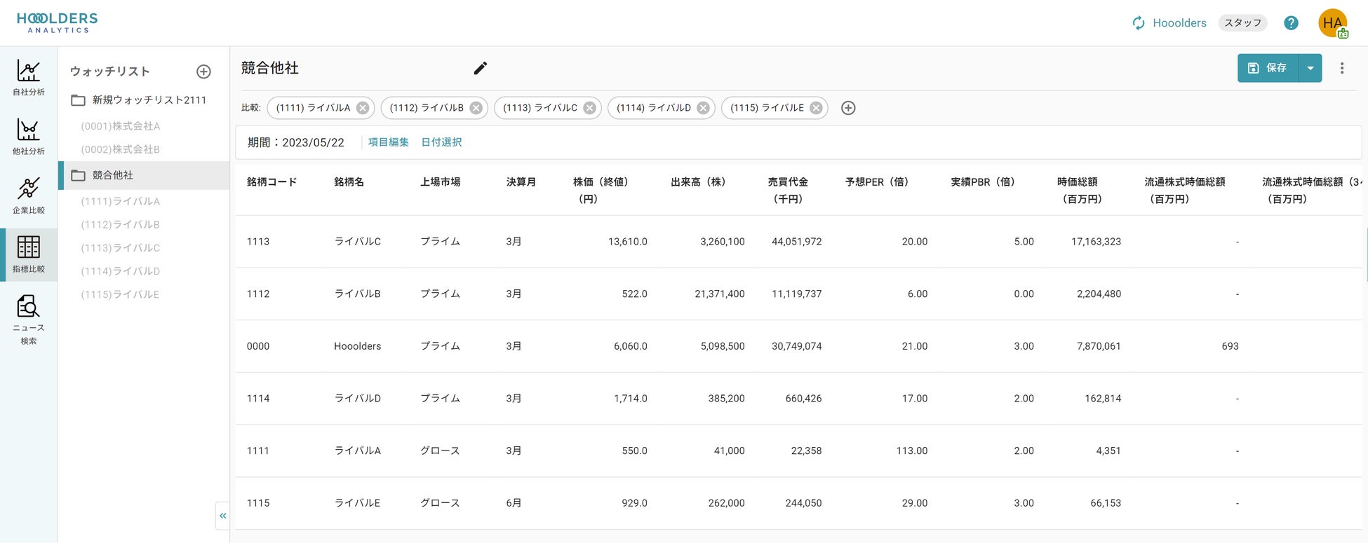 □PERなどの財務指標を競合と一覧比較しcsv出力可能