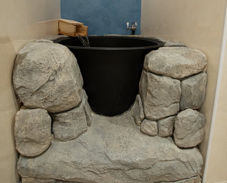 冷がやわらかく伝わり、まろやかな水加減が肌にやさしい、日本国内で唯一の鋳物[いもの]の風呂釜。 その体感温度は水温以上に冷たく感じ、そしてまろやか。深い浴槽は身体を包むように気持ちが良い。