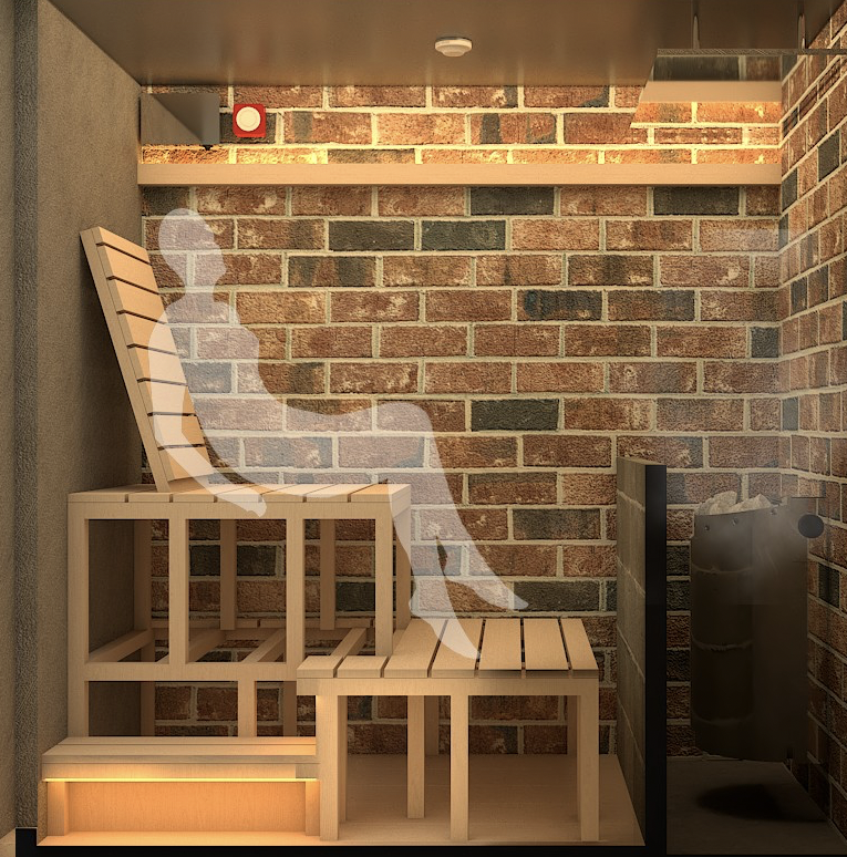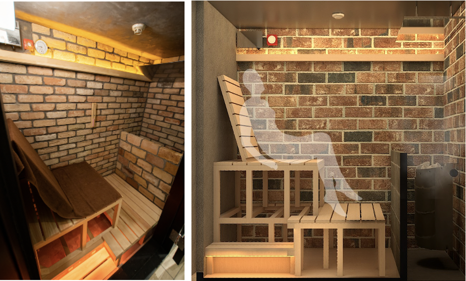 4段階角度調整出来るオリジナルリクライニングベンチを考案。ベンチの真正面にストーブを配置し、ロウリュの熱と蒸気がダイレクトに頭から降り注ぎ体感温度は一気に上がります。お好みの角度でリクライニングし心身をリラックスさせる事ができます。
