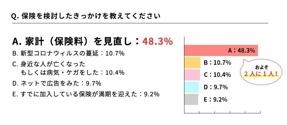 SBI生命の保険商品については、お手頃な保険料を求める多くのお客さまからお申込みをいただいており、2022年3月に実施したアンケート(※2)では、SBI生命の保険商品にご加入中のお客さま393人のうち、およそ2人に1人の方が「家計(保険料)を見直し」をきっかけとしてSBI生命の保険商品にご加入されたという結果となりました。