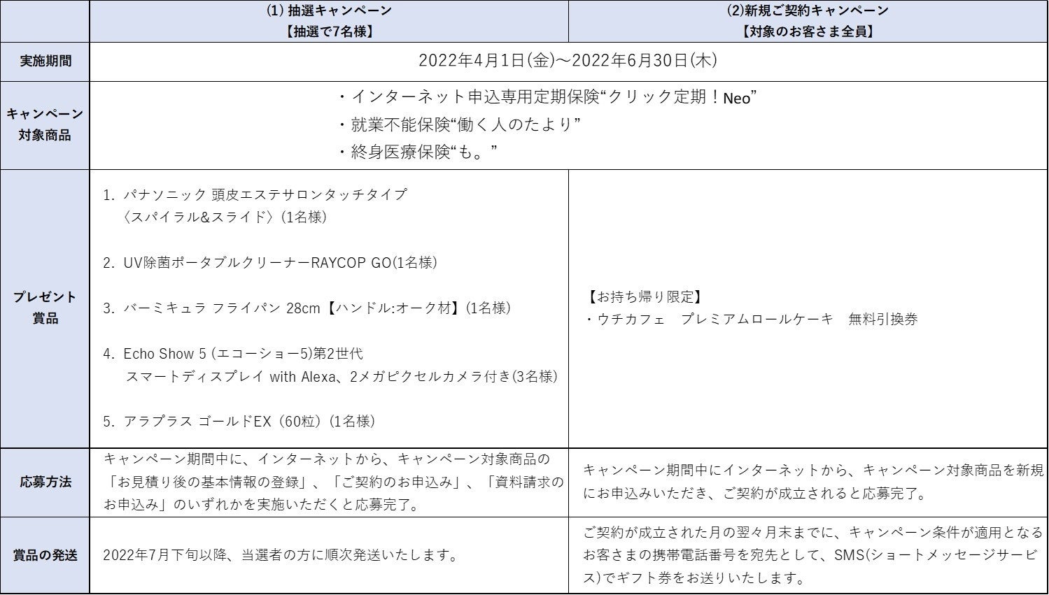 ぜひこの機会に、まずは10秒お見積りで保険料をご確認いただき、家計の見直しをご検討ください。キャンペーン対象商品は、インターネット申込専用定期保険“クリック定期!Neo”、就業不能保険“働く人のたより”、終身医療保険“も。”の下記3商品です。