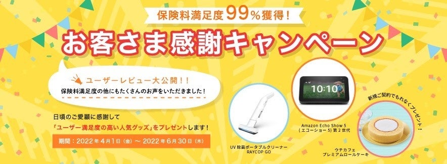 本キャンペーンは、SBI生命の保険商品にインターネットで申込みいただいたお客さまを対象に実施したアンケート(※1)にて、保険料満足度99%をいただいたことを記念して実施いたします。