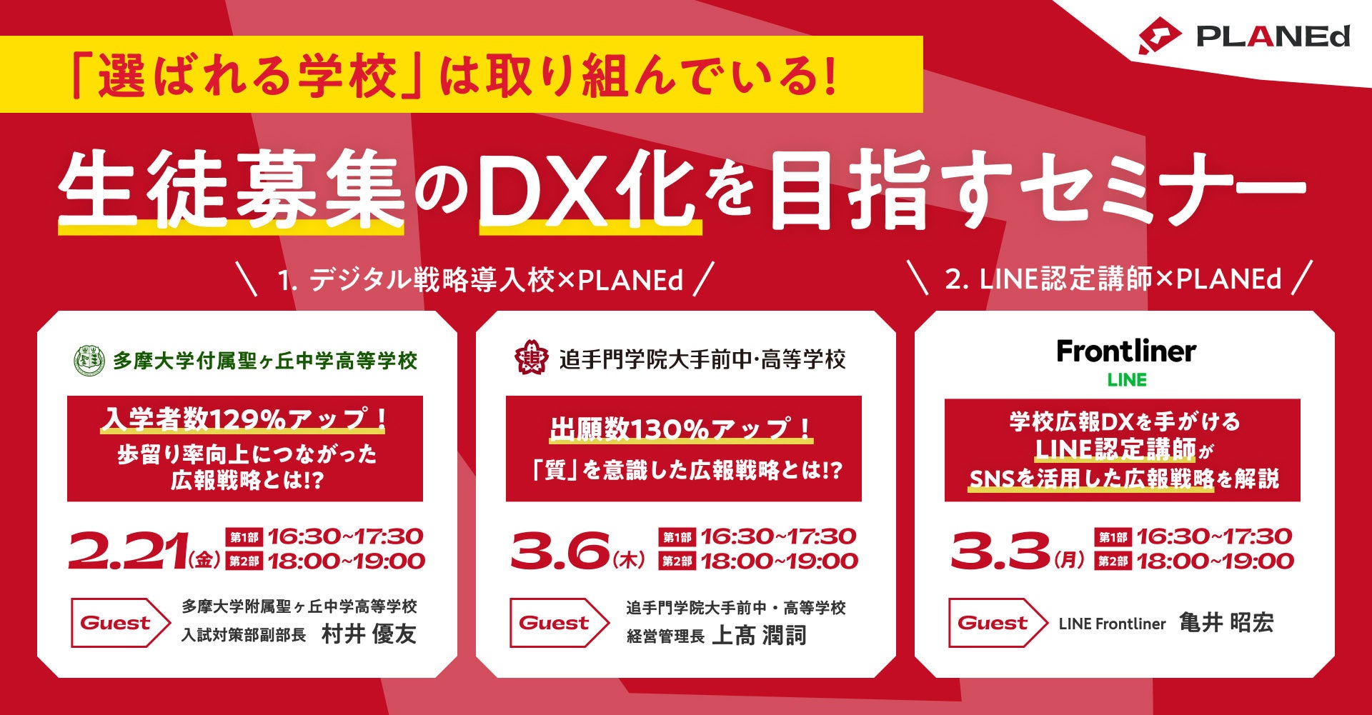 “学校の明日を強くする”をミッションに掲げ、学校広報のDX化をサポートする株式会社PLANEd(本社:東京都渋谷区、代表取締役:佐藤光一郎)は今後の入試広報対策を検討している、全国の私立学校の経営者・管理職・広報担当者向けに、WEBセミナーを開催します。