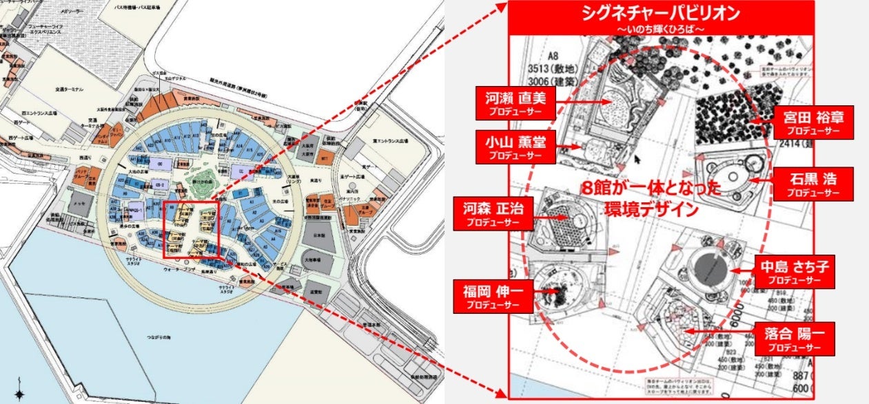 テーマ事業は大阪・関西万博を象徴・代表する事業であり、8人の専門家がつくるパビリオンは、テーマをそれぞれの哲学から語り深める「署名作品」でもあることから、「シグネチャーパビリオン」と名付けました。8名のテーマ事業プロデューサーが大阪・関西万博のテーマ「いのち輝く未来社会のデザイン」を、それぞれ固有の観点から解釈、展開し、未来に生きる人々に繋ぎ渡すパビリオンを建設します。