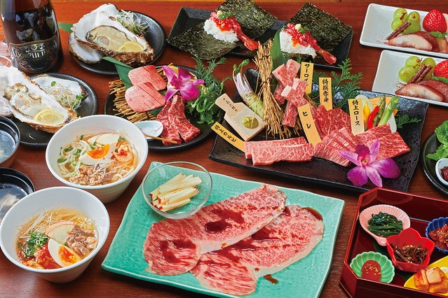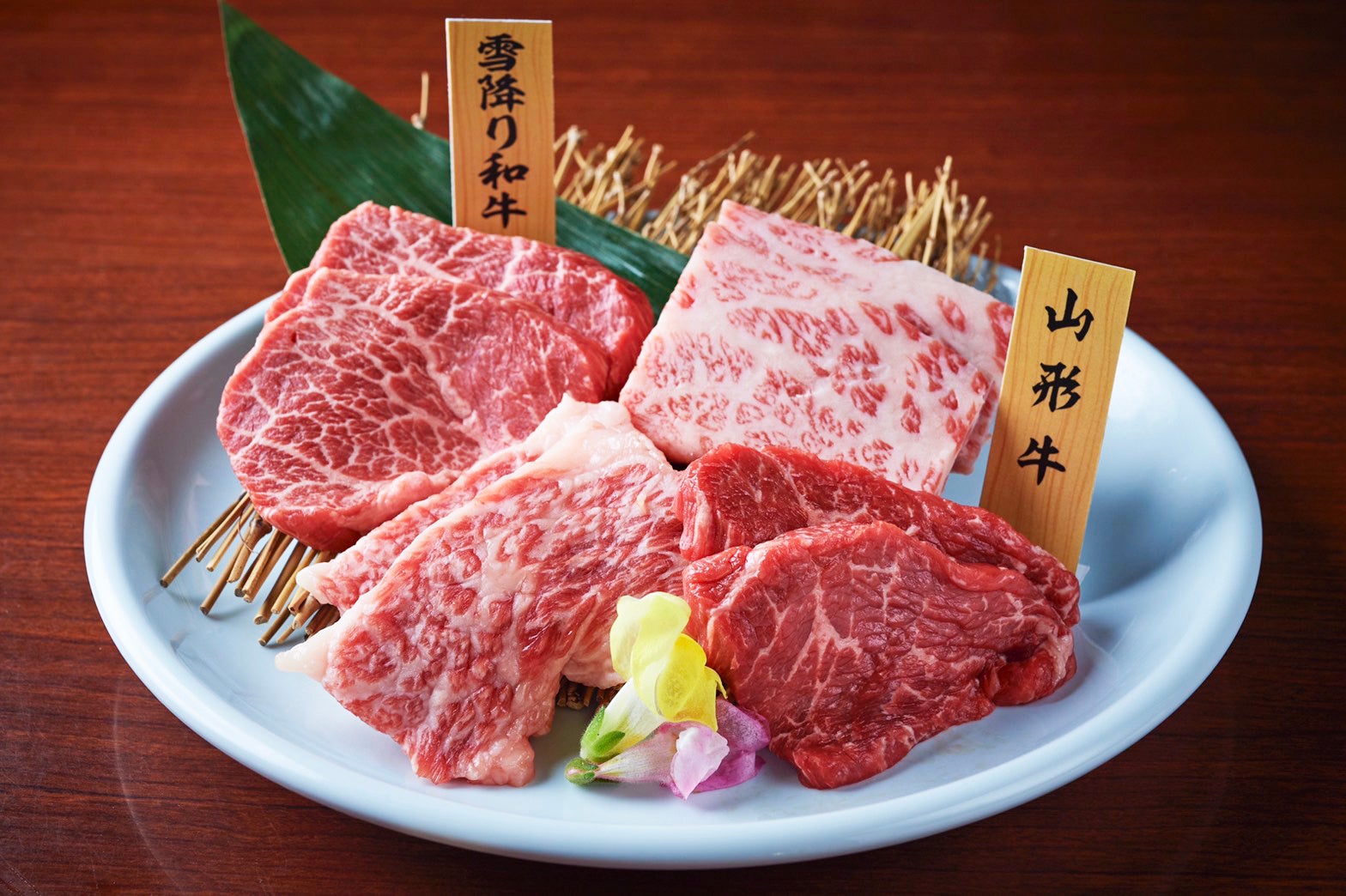 ⼭形産⿊⽑和⽜の中でも極上の逸品のみが呼ばれる「雪降り和⽜ 尾花沢」をフィーチャーしたワンランク上の炭⽕焼⾁店