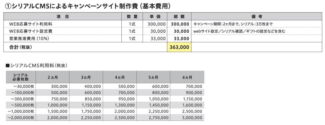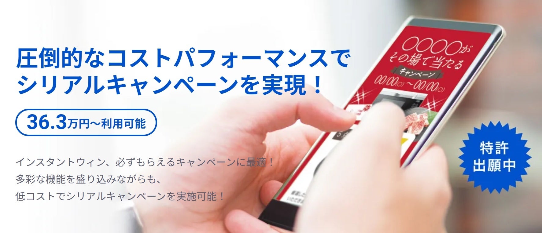 シリアルを使った仕組みで、❶インスタントウィン、❷必ずもらえるキャンペーン、❸先着順で必ずもらえるキャンペーンを、36.3万円から運用できます。