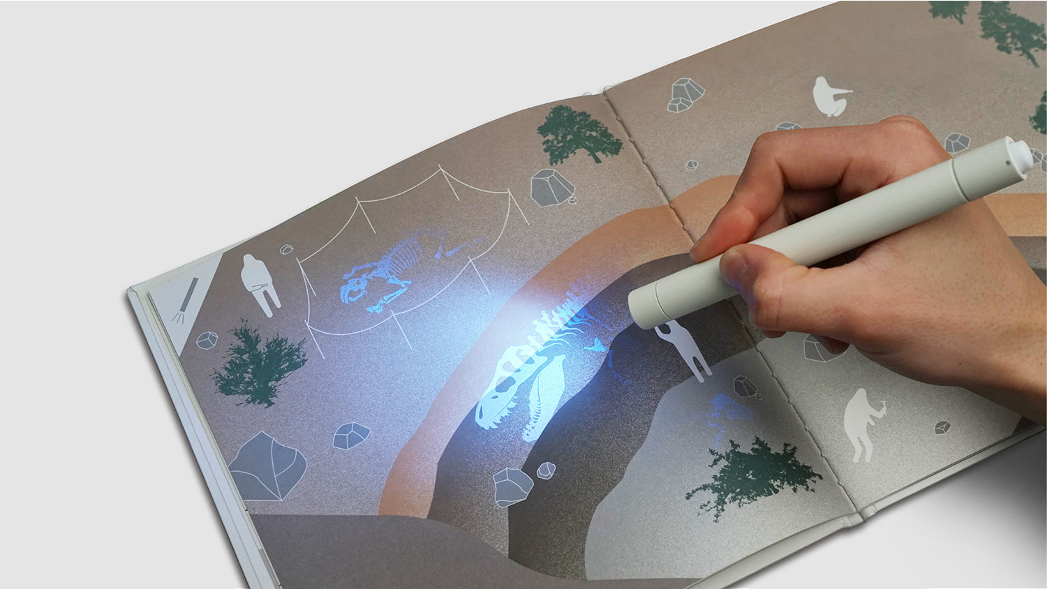 本製品は特殊な印刷技術を使用した、絵本・シール・ブラックライトのセットで、絵本内の隠れた化石をライトで照らして見つけたり、シールを家の中に貼り付けライトを当てながら探すことで、古生物学者のような化石探しを体験できます。