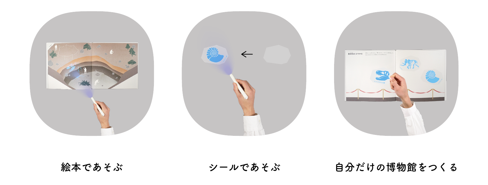 絵本やシールにブラックライトを当てて化石を見つけて遊ぶことはもちろんのこと、見つけたシールを絵本内に貼り付け、自分だけの博物館をつくるなど、組み合わせて使うことでより一層楽しむことができます。