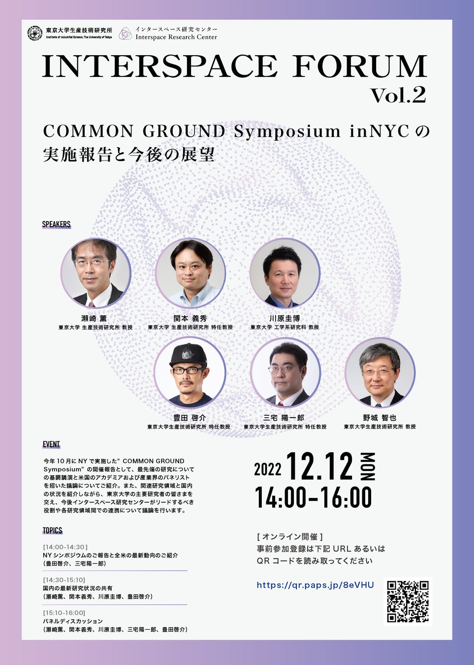 本フォーラムでは、2022年10月にNYで実施した”COMMON GROUND Symposium in NYC”の開催報告として、最先端の研究についての基調講演と米国のアカデミアおよび産業界のパネリストを招いた現地で議論した内容をご紹介いたします。また、関連研究領域と国内の状況を紹介しながら、東京大学の本領域に関わる主要研究者の皆さまを交え、今後インタースペース研究センターがリードするべき役割や各研究領域間での連携について議論を行います。