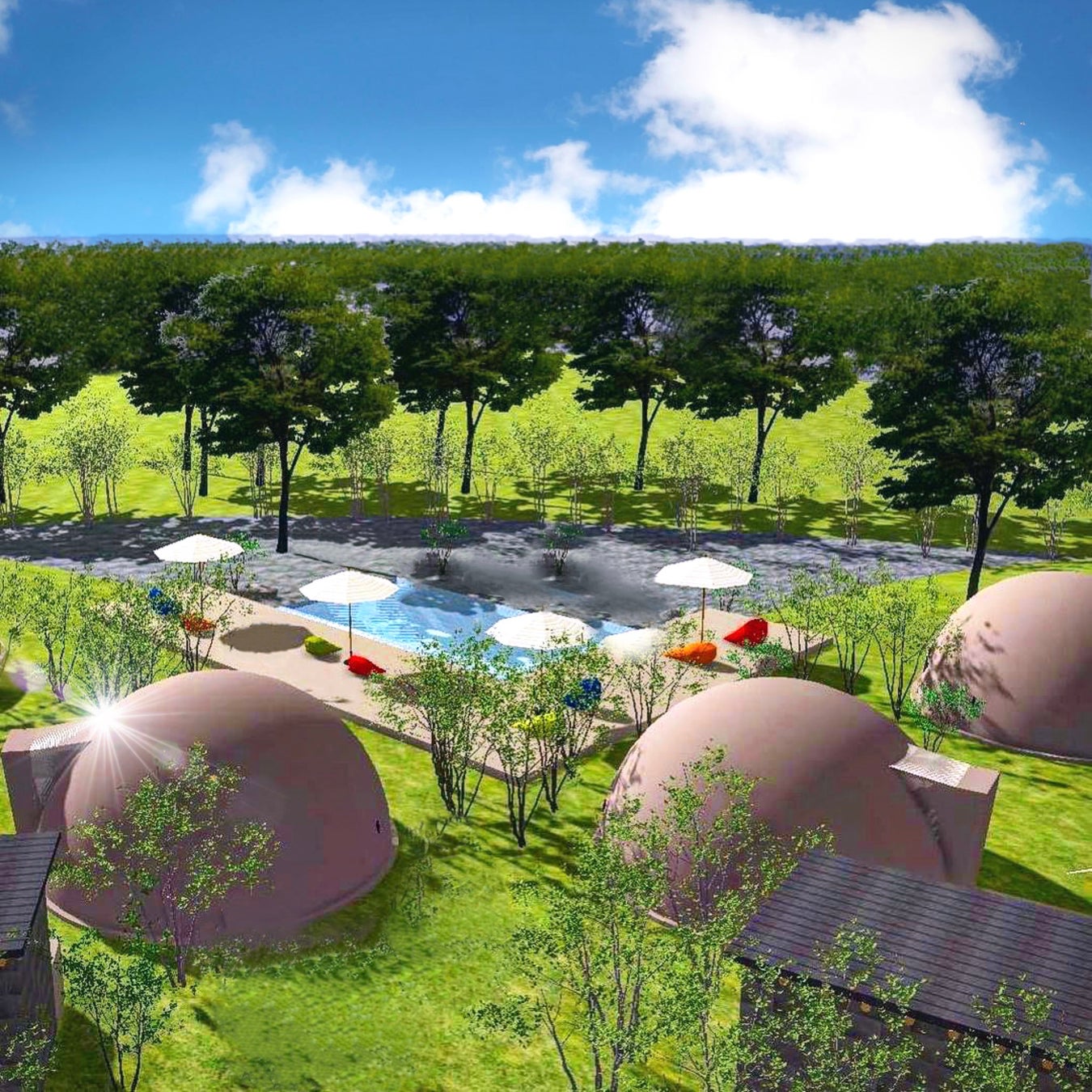 グランピング棟のオープンも間近です。宿泊者専用の屋外プールがございますので、夜はライトアップされたナイトプールでお過ごしいただくのもおすすめです!(ナイトプールは季節限定)