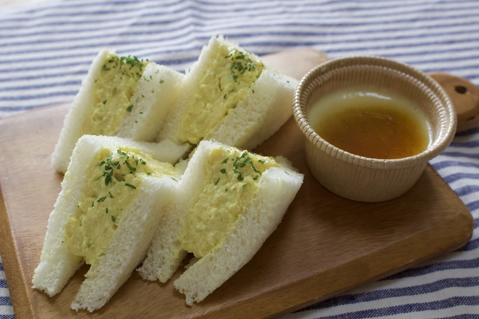 【タマゴサンド】弊社商品の『UMAMI EGG 2.0』使用の「タマゴサンド」はべジマヨや調味料等と合わせ、卵ならではの風味・鮮やかな見た目・黄身と白身の食感を再現しております。卵・乳不使用のやさしい食パンにサンドされた、ふんわりとしたタマゴサンドです。