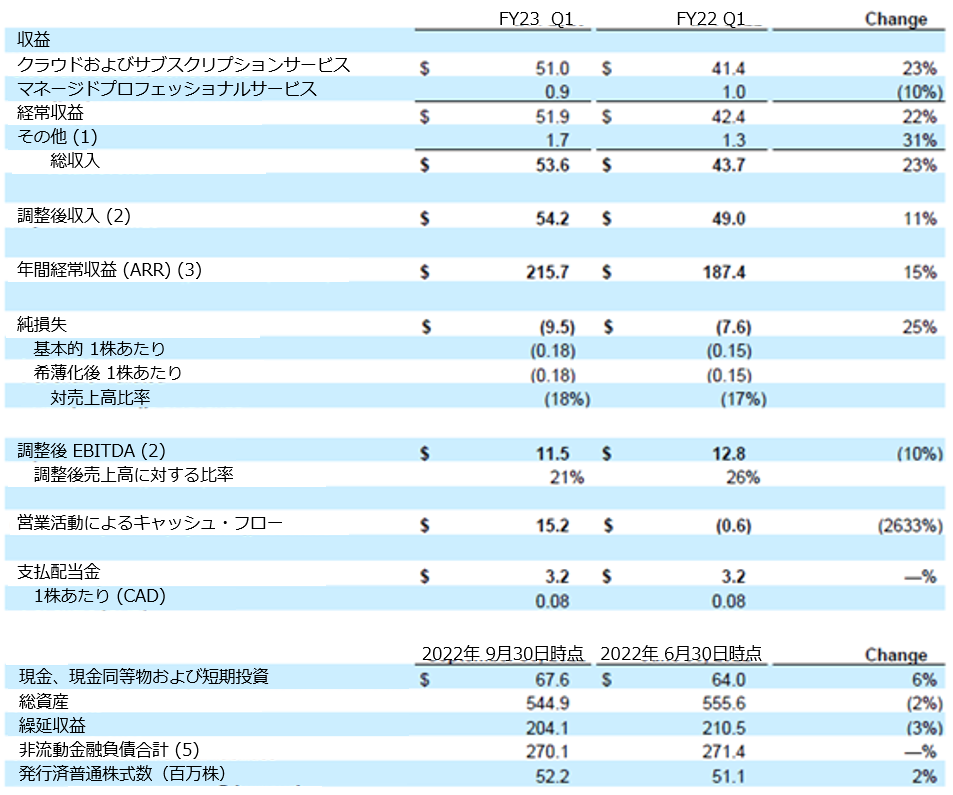 - 調整後収益 (1) は、FY23 Q1 に 5,420 万ドルで、FY22 Q1 から 11%増加した