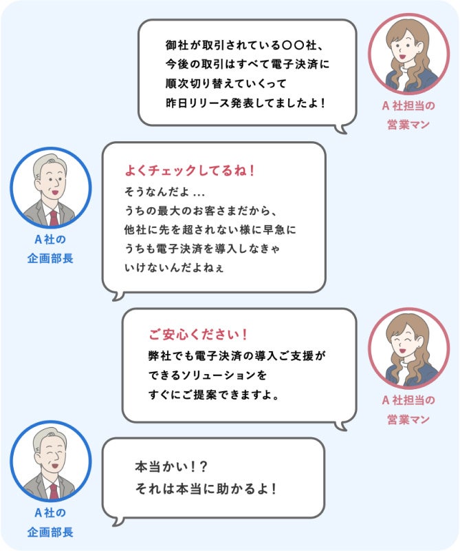 企業の発信したい最新情報を入手することができますので、顧客との関係性を向上するきっかけとして活用することができます。例えば、顧客の商品のリリース情報に合わせていち早く連絡をいれれば、「この担当者は自社のことを気にかけてくれている」と好印象を与えることができます。