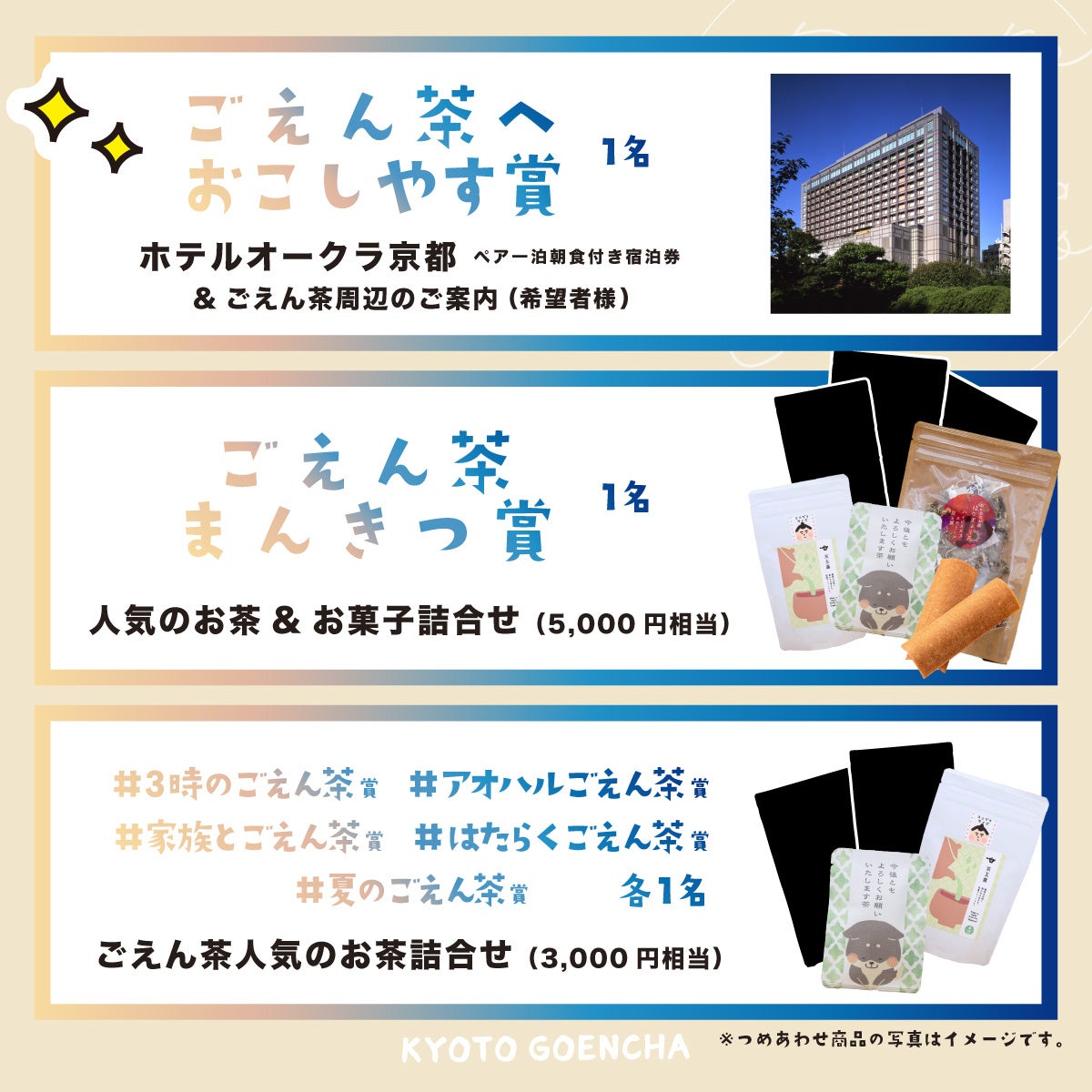 応募者の中から合計7名様に、ホテルオークラ京都ペア宿泊券を目玉とした、ごえん茶オリジナルギフトをプレゼントいたします。