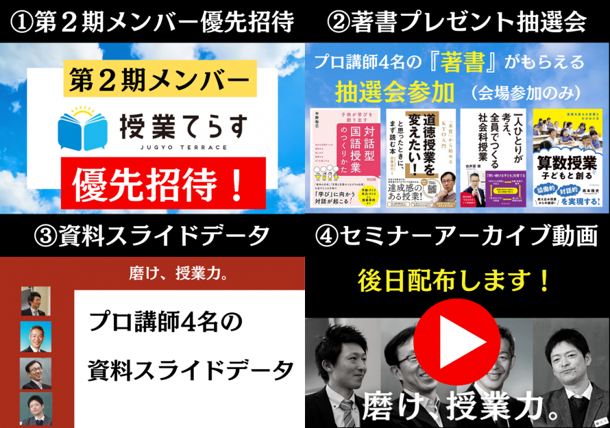 本セミナーでは、一流のプロ教師4名による授業を参加型で体験できます。授業を体験した後に授業解説を聞くことでインプットできます。さらに、会場やオンラインに集まった熱量高い先生との対話をとおしてアウトプットすることもできます。「対話」と「深い学び」を主なテーマに、子どもが学びたくなる授業をするための知見をより実践的に体得できる内容になっています。