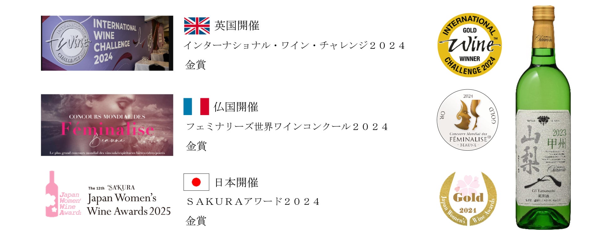 既に発表されている女性専門家のみで審査される日本開催「SAKURAアワード2024」、仏国開催「フェミナリーズ世界ワインコンクール2024」の両コンクールでも金賞を受賞しており、今回の受賞で3か国目の金賞受賞となります。