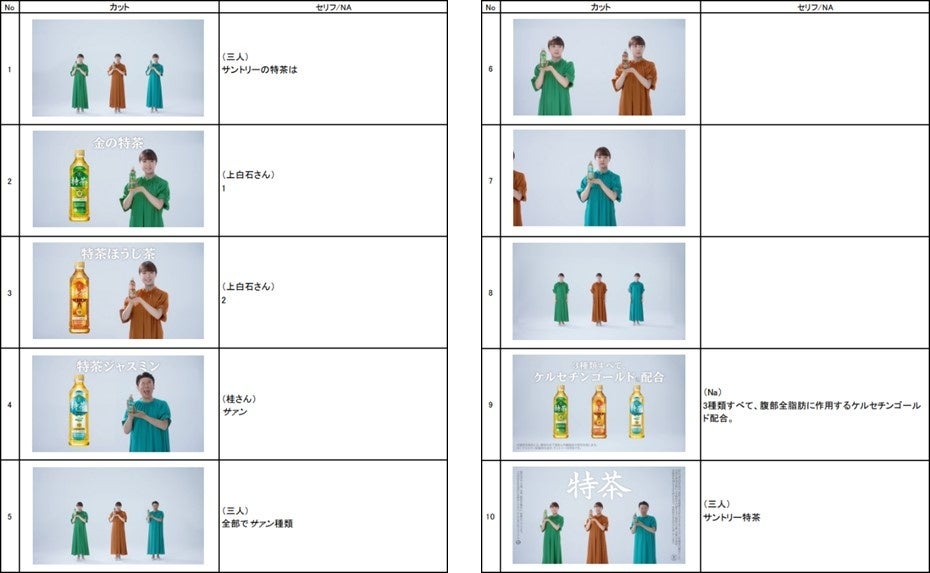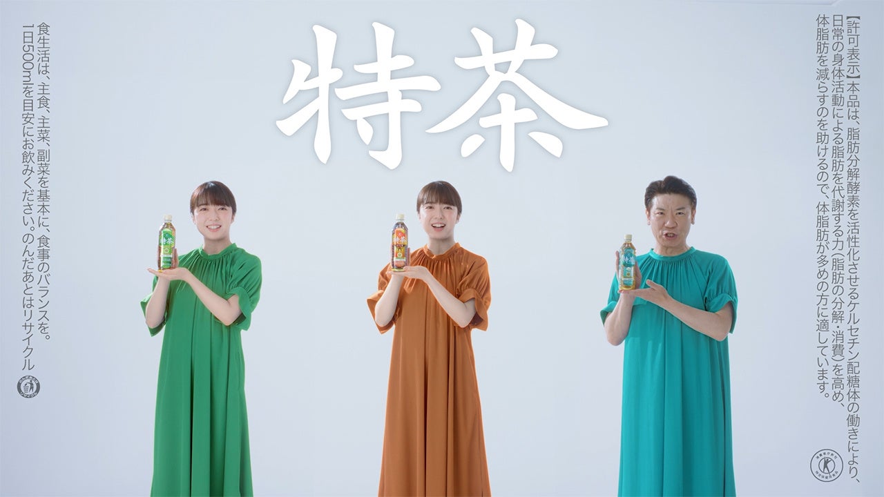 今年4月に大刷新した「特茶」に続き、「特茶 ほうじ茶」「同 ジャスミン」についても、新たに許可を受けた「ケルセチン配糖体」の“日常の身体活動による脂肪を代謝する力(脂肪の分解・消費)を高める”というメカニズムを許可表示に掲げ、「ケルセチン配糖体」をモチーフとした新ボトルへと刷新します。動画本編では、上白石萌音さんと桂三度さんが3種類の「特茶」のパッケージにちなんだ緑(金の特茶)、茶(特茶ほうじ茶)、青(特茶ジャスミン)の衣装に身を包み登場します。昨年10月から訴求している、「特茶」ならではの関与成分「ケルセチンゴールド(※)」が3種類すべてに配合されていることを桂三度さんのおなじみのネタに乗せて伝えます。