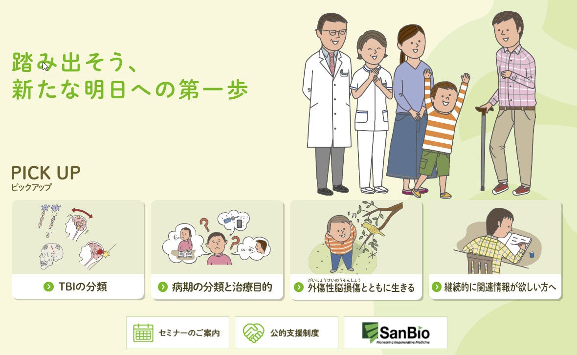 TBIナビ🄬は、サンバイオが運営する情報サイトで、外傷性脳損傷患者さん(当事者)やご家族の疾患や治療知識の向上支援や、再生医療、支援制度などの情報を中心に発信してまいります。