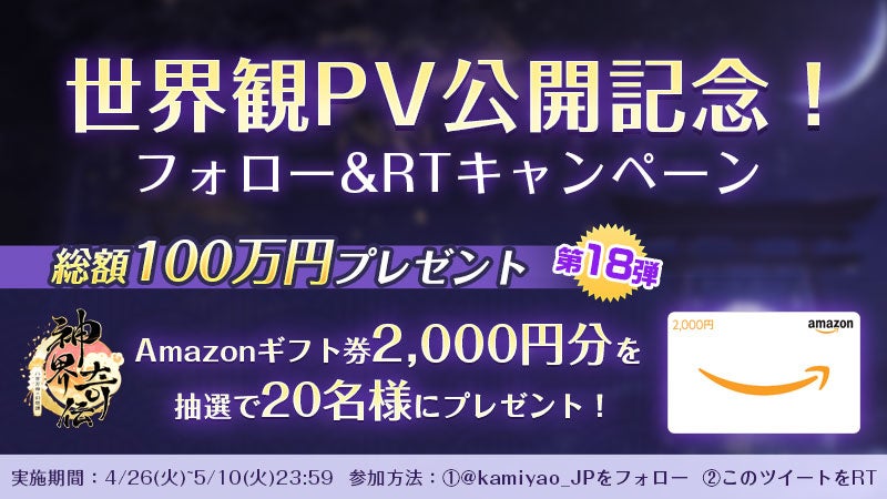 4月26日(火)~5月10日(火)までにかけて、『神界奇伝』公式Twitterでは世界観PV公開の祝に、「総額100万円Twitterプレゼントキャンペーン」の第18弾を開催し、抽選で合計20名様にAmazonギフト券2,000円分が当たるフォロー&RTキャンペーンも開催中です。ぜひ世界観PVや投稿ツイートの内容もお楽しみいただきながら、キャンペーンにご参加ください。