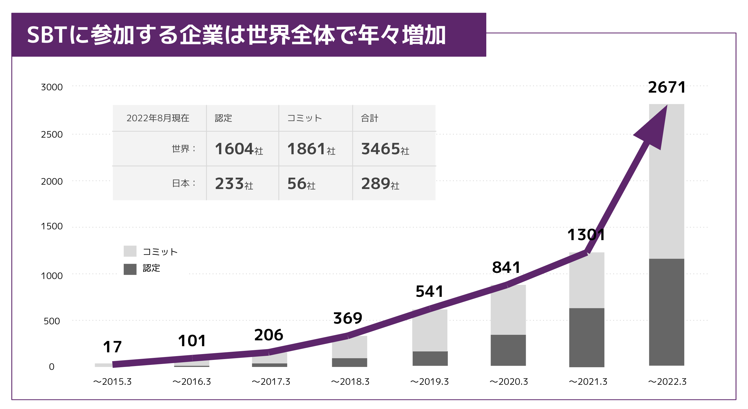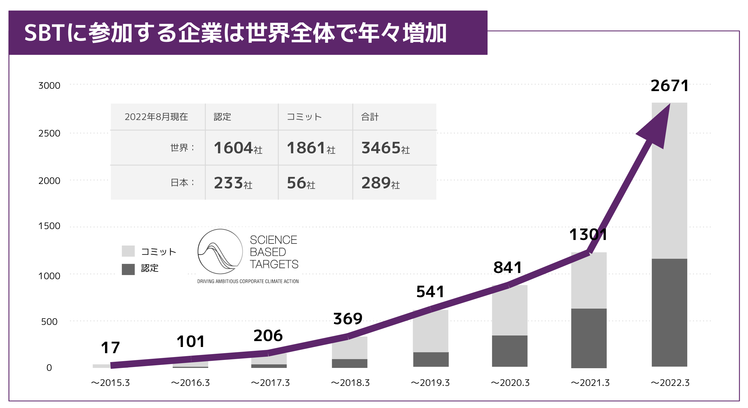 パリ協定(世界の気温上昇を産業革命前より2℃を十分に下回る水準(Well Below 2℃)に抑え、また1.5℃に抑えることを目指すもの)が求める水準と整合した、5年~15年先を目標年として企業が設定する温室効果ガス排出削減目標のことです。「Science-based Targets」の頭文字を取った略称で、日本語では「科学的根拠に基づく目標」とも呼ばれています。気候変動対策に関する情報開示を推進する機関投資家の連合体である(CDP)、国際環境NGOの世界資源研究所(WRI)、世界自然保護基金(WWF)、国連グローバル・コンパクト(UNGC)の4つの国際機関によって運営されており、近年、企業活動における脱炭素への取り組みは企業ブランド価値を大きく左右する重要課題としてステークホルダーより評価されることからも、国際基準として権威性の高いSBTに参加する企業は年々増加しています。
