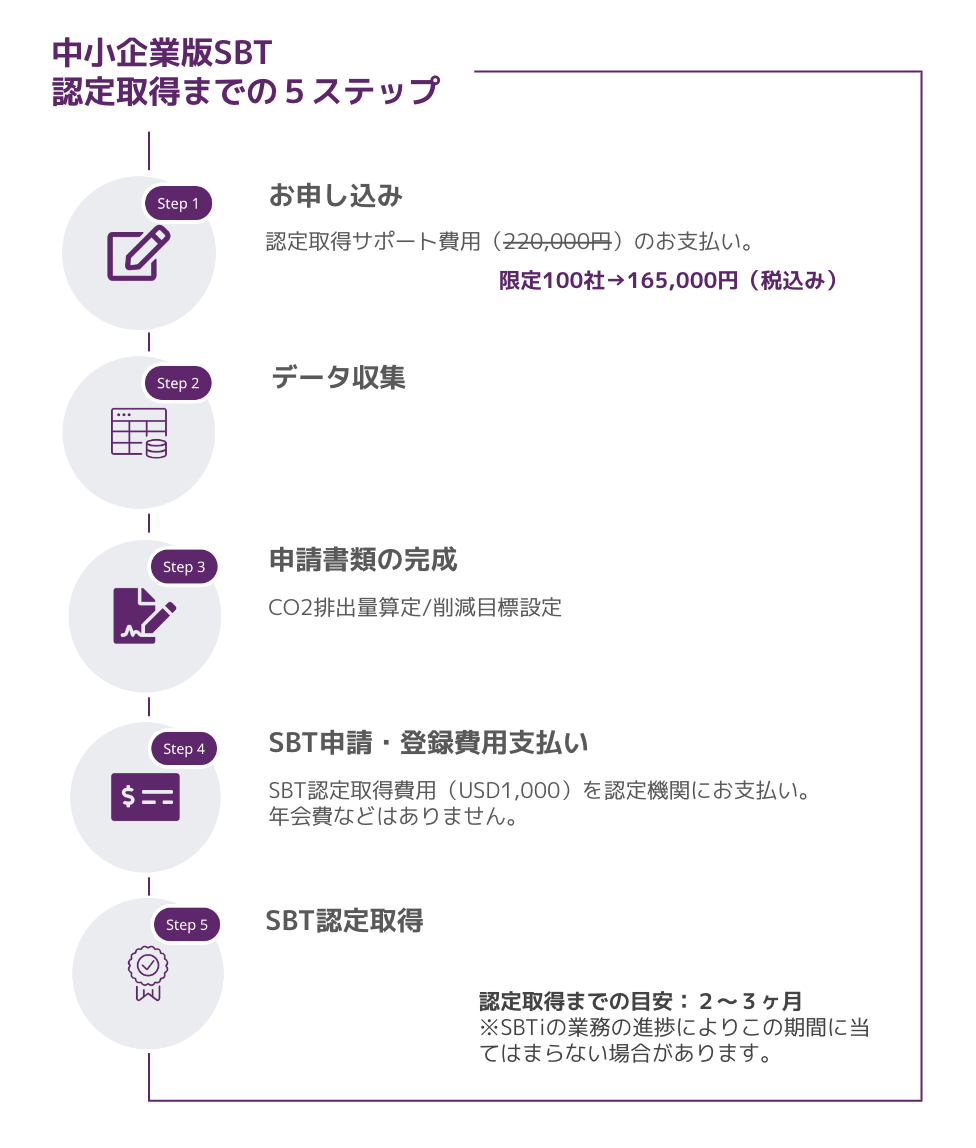 | 認定取得サポート費用 220,000円(税込み)のところ、 100社限定で、165,000円(税込み)にてサービス提供。 ※別途SBT認定費用が1,000ドルSBTiへ必要です。 |