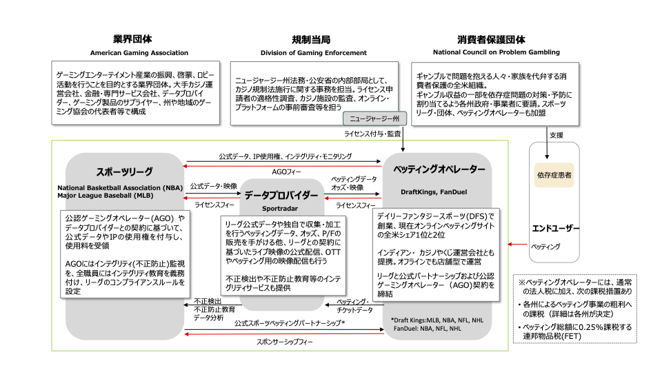-2018年のPASPAの違憲判決後、デイリーファンタジースポーツ(※)を提供する米国企業が、優れたUI/UXを提供する素地を有していたことからスポーツブックオペレーターとしても急成長した。また、スポーツブックオペレーターを公認すること、データプロバイダーとライセンス契約を結ぶことから得られる手数料等、スポーツリーグは新たな収益源を得ると同時に、ファンエンゲージメントの向上により放映権をはじめとした価値の底上げも実現している。