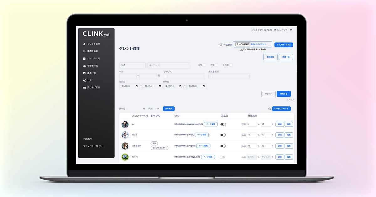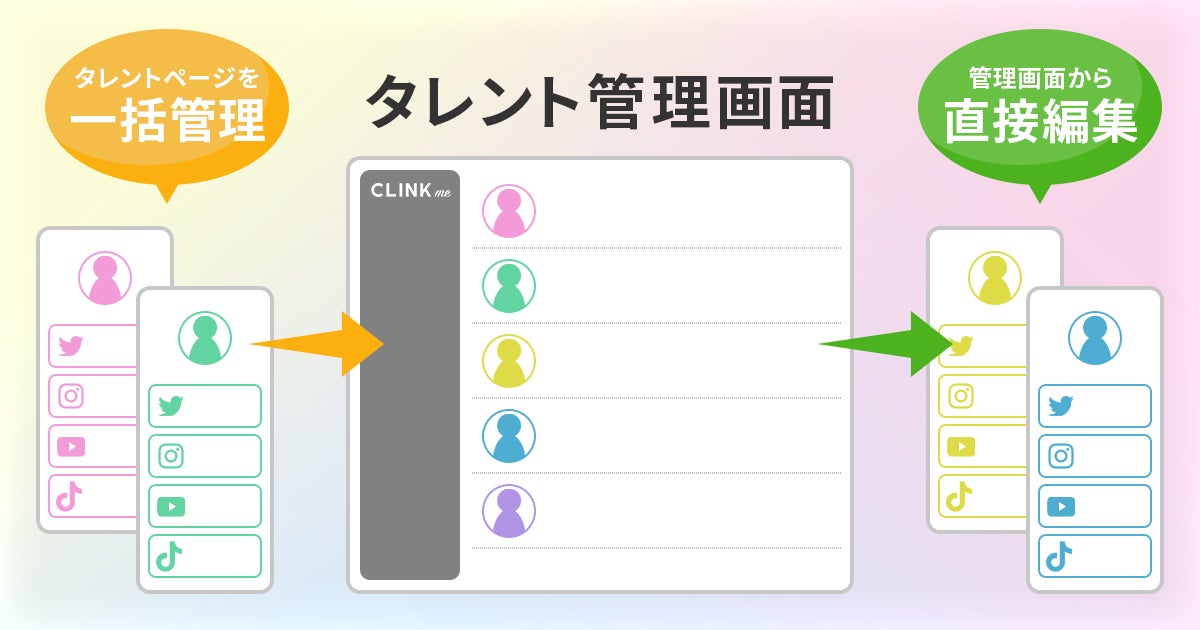 リンクまとめ「CLINKme(クリンクミー)」に新機能。芸能プロダクションからの要望に応え、所属するタレントを事務所側が一括管理できる「タレント管理機能」を追加!