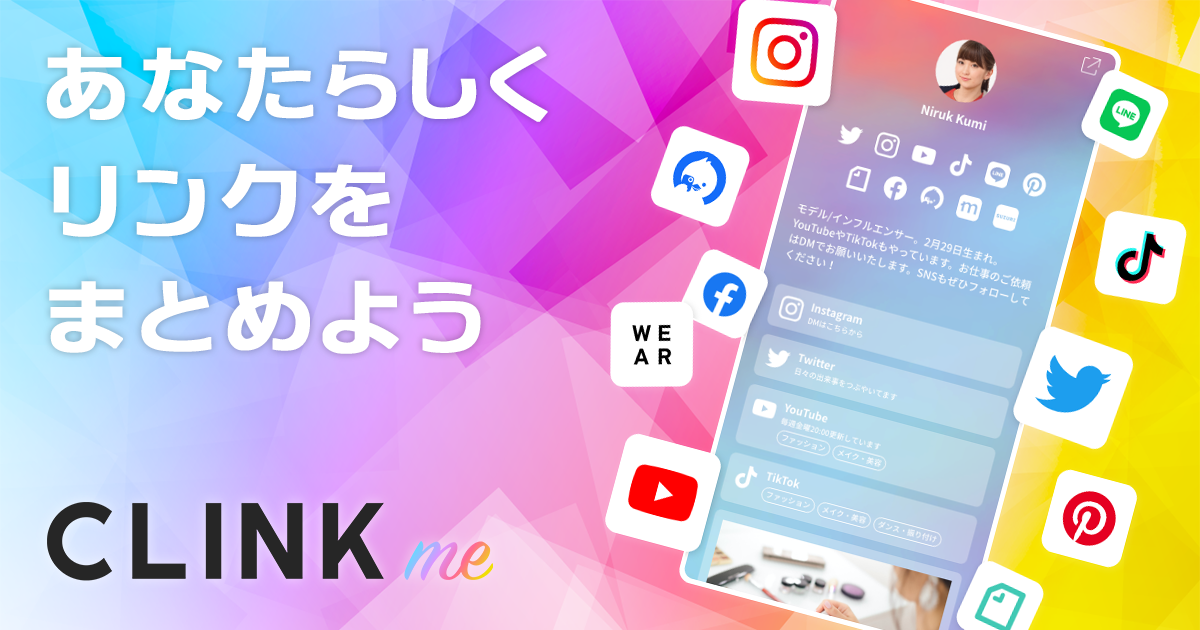 CLINKme(クリンクミー)は、Twitter、Instagram、YouTube、TikTokをはじめとする各種SNSやWebサイトのリンク、プロフィールなどを自分専用のページで1つにまとめられるサービス。