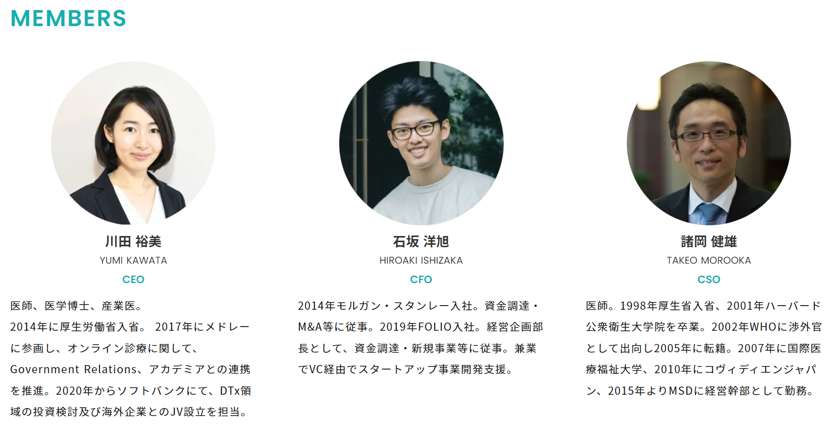 代表取締役CEOの川田裕美は医師として初期臨床研修終了後、厚生労働省に入省、難病対策、感染症対策等に従事したのち、株式会社メドレーにてオンライン診療の普及、日本初の遠隔服薬指導の実施、ソフトバンク株式会社にてDTx領域の投資検討・海外企業とのJV設立等、一貫して医療の発展に貢献する業務に携わってきました。オンライン診療の普及が進む中で、テクノロジー活用により、リモートで病院の診療を受けられる環境が当たり前になった先に本質的に診療の質が上がるソリューションが必要であると思いに至り、治療用アプリを開発する企業を創業しました。