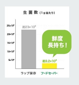 ラップ保存とフードセーバーの真空保存で菌の増殖量を測定したところ、フードセーバーの真空保存は約86%も菌の増殖を抑えることが分かりました。