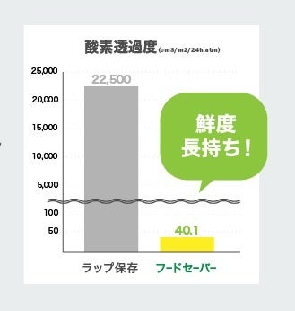 一般的なラップとフードセーバーのパックロールの酸素透過度を測定したところ、フードセーバーのパックロールは、ラップに比べて約99%も酸素を通さないことが明らかになりました。