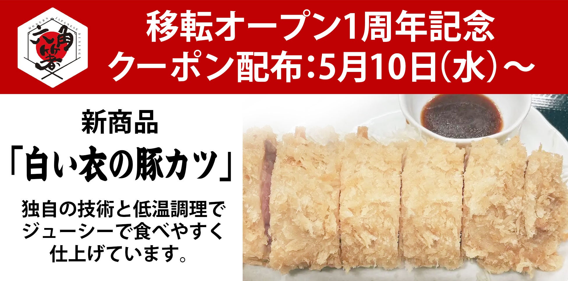 長引くコロナの影響から試行錯誤、満を持して投入の新商品「白い衣の豚カツ」。店主「慢性骨髄性白血病」と向き合った1年間。移転オープン1周年記念キャンペーン、2023年5月10日(水)からクーポン配布。