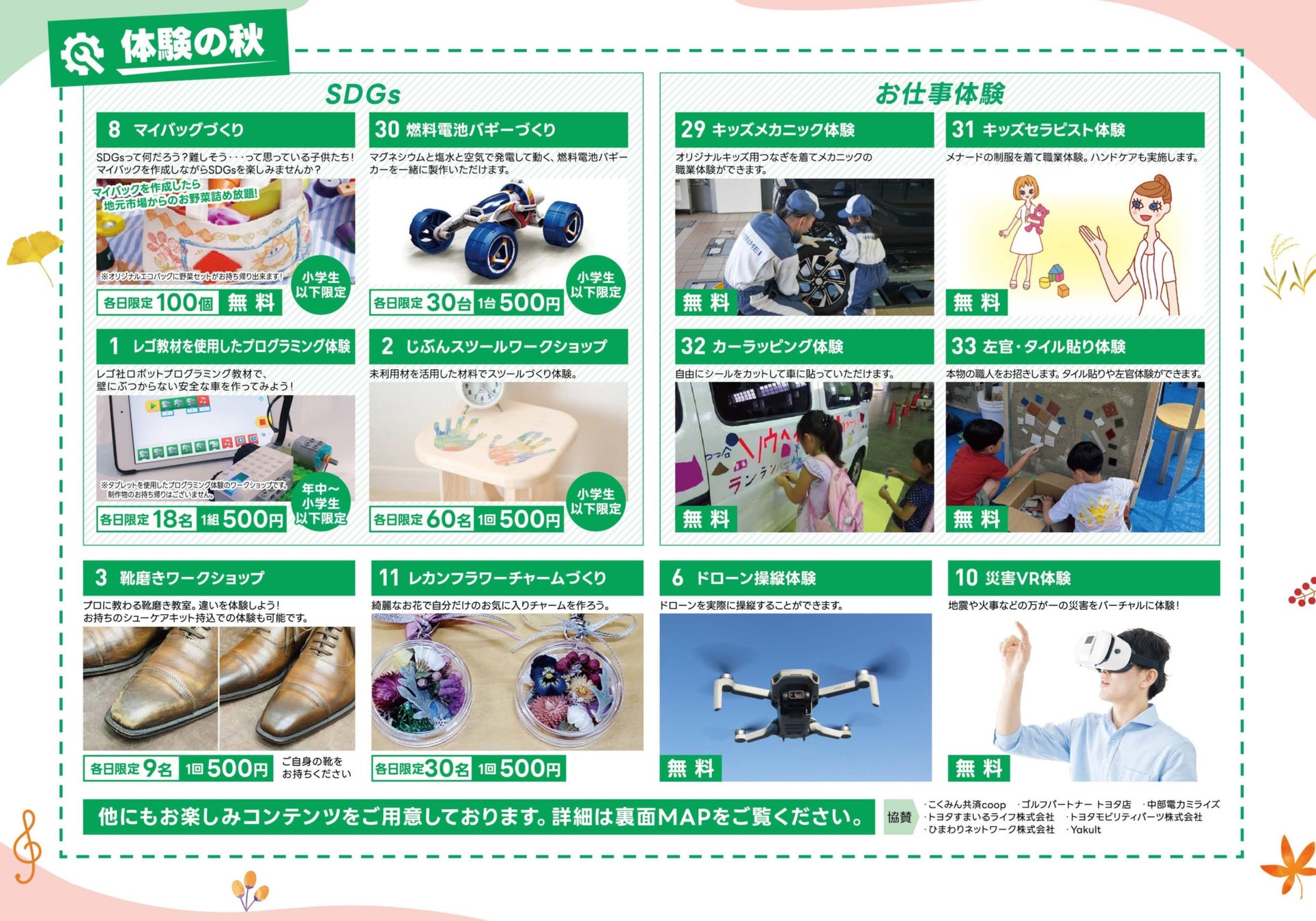親子で楽しめる『マイバックづくり』やお仕事体験『キッズメカニック』、SDGs『燃料電池バギーづくり』など体験が盛りだくさん、ゲストに豊田ご当地アイドルStart様や中部電力ミライズ様からはカテエネコ(11日)、ラジオパーソナリティの里園侑希様(12日)もお呼びしており、楽しいイベントをご用意、是非お気軽にお越しください。