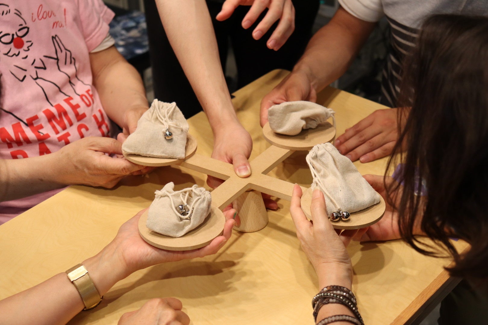 今回の「超福祉の図書館」における体験会では、私たちが開発した「見ても見なくても見えなくても楽しめるボードゲーム グラマ」を体験していただきます。それぞれが持っている重さの違った袋の重さを表現していき、重さを全員で揃えていく協力型のボードゲームです。普段は意識をしない「重さの感覚」と、重さが揃っているか確認するために天秤に乗せるときのドキドキ感を是非楽しんでください!