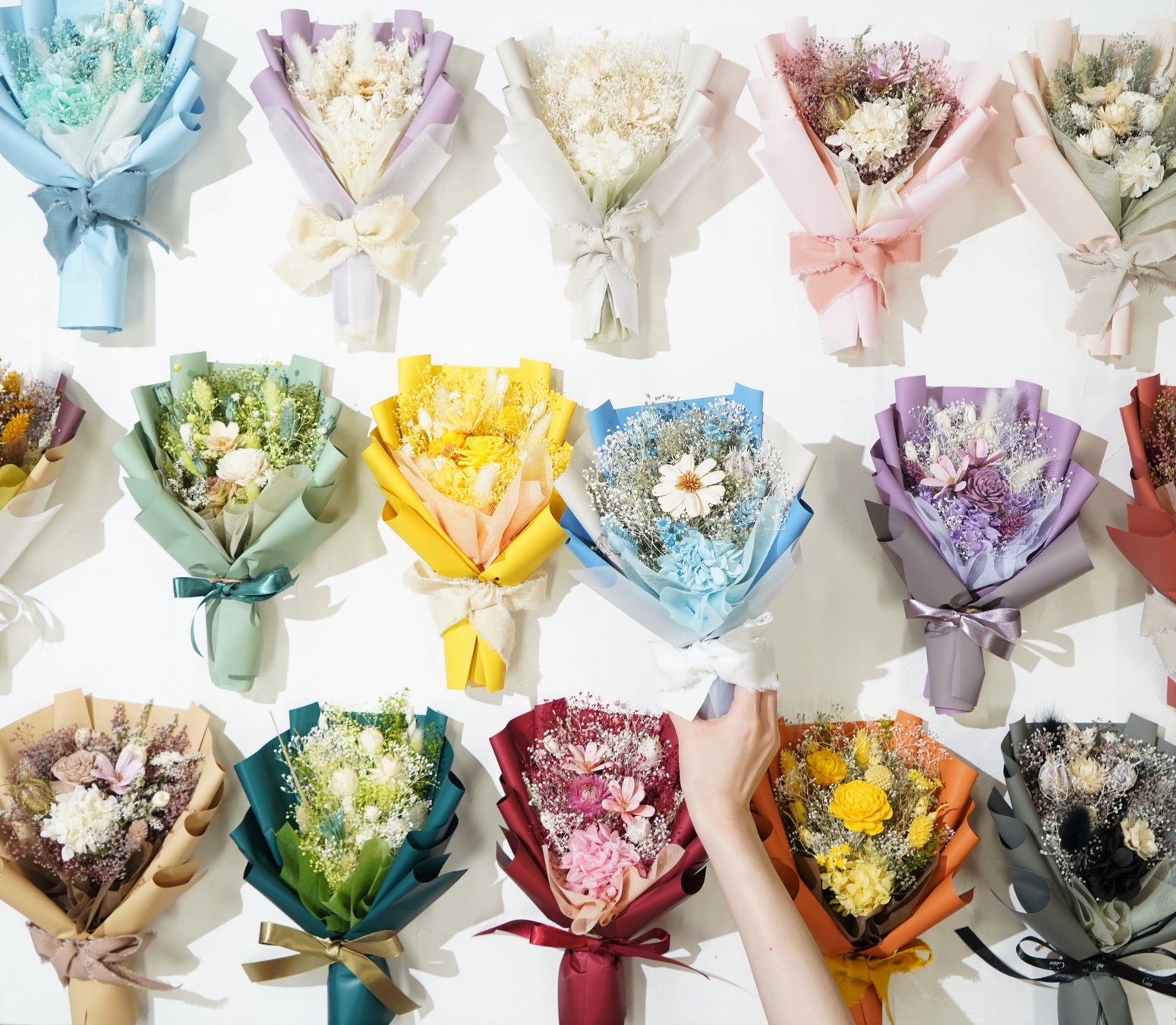 豊富なカラーバリエーションの花束を多数ご用意しております。ドライフラワーはもちろん、花束のラッピングペーパーやリボンも多色揃え、1つ1つお花の種類やカラーが異なるためお客様それぞれお気に入りの花束を見つけることができます。店頭に並んでいる花束をご購入の場合、リボンに関しましてはお客様自身でセレクトすることが可能です。