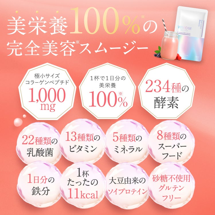 完全美容スムージー「VINOM」は、たった1杯で1日の美栄養100%を補給するだけじゃなく他にも秘密があります。
