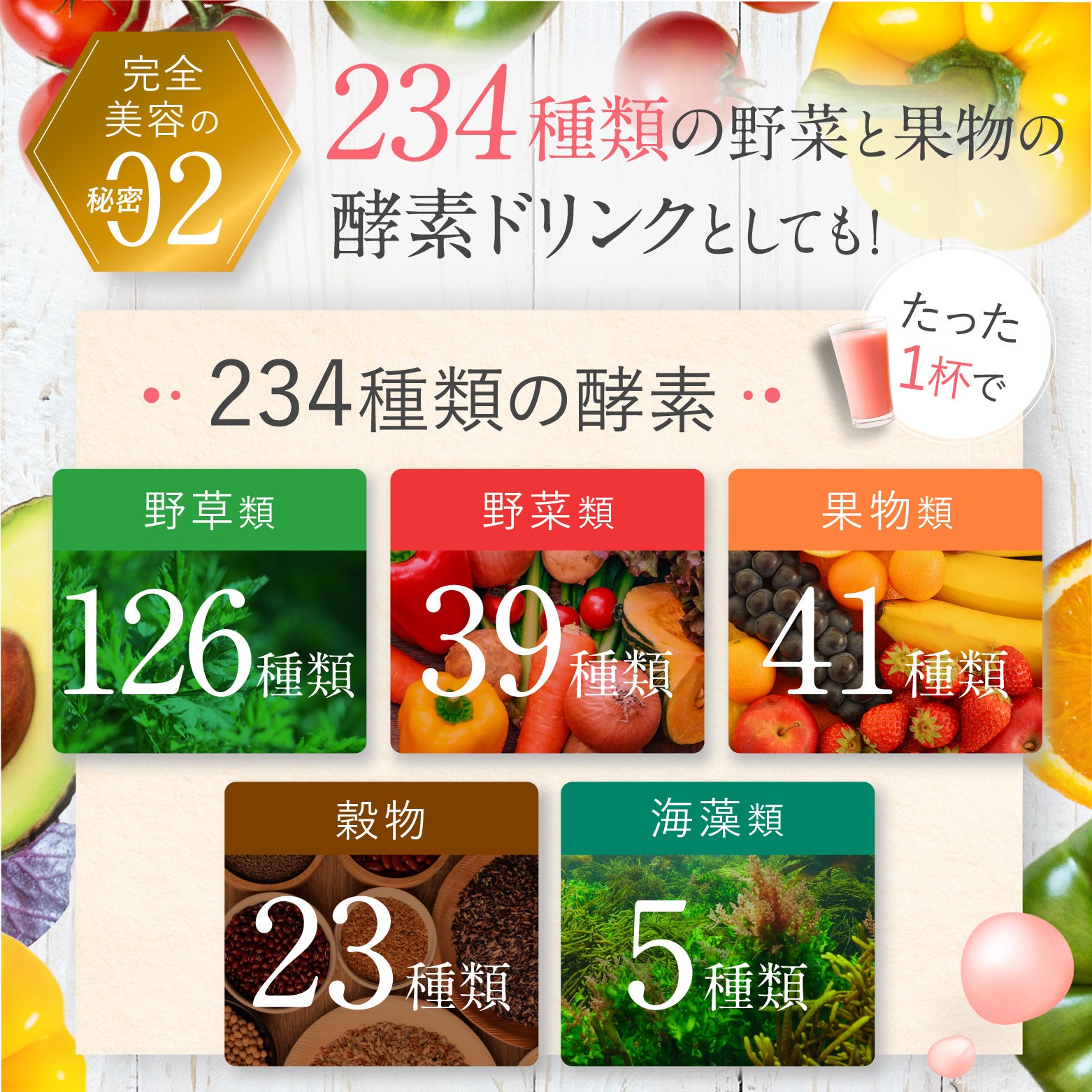 ②234種類の野菜と果物などの酵素+18種類のビタミン・ミネラルなどで美栄養たっぷり!