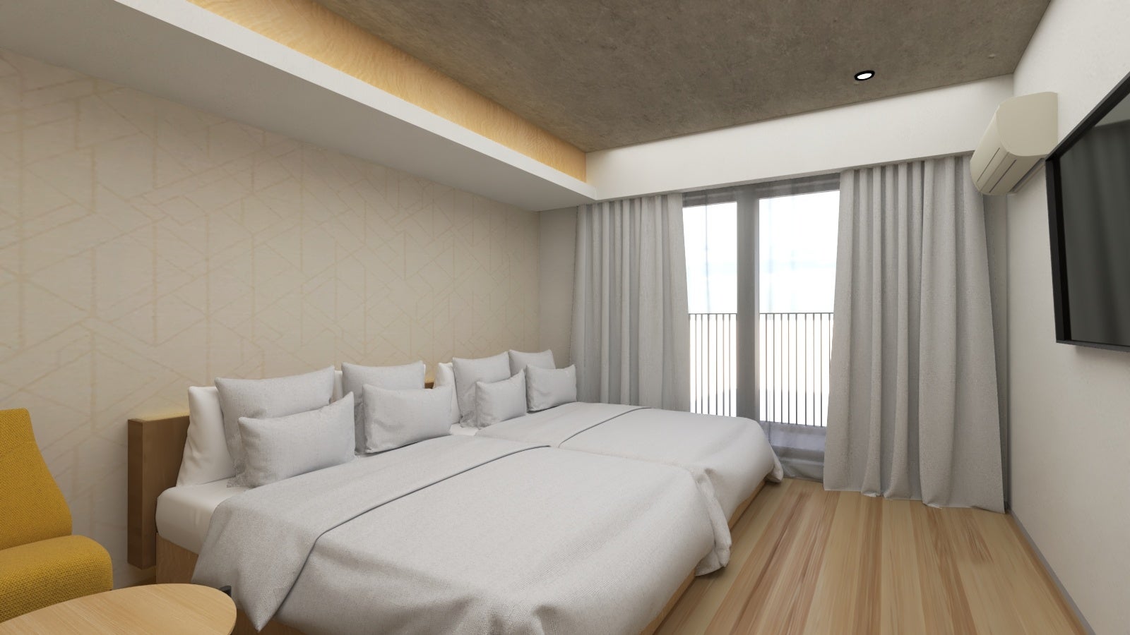 4,リビング中心の構成+グローバルスタンダードベッド:一般的なホテルはベッドが主体の構成であるが、家族が部屋で過ごしやすくするためにリビングスペースを主体の構成に。