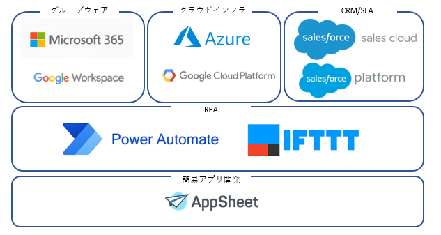 例えばMicrosoft365やGoogleWorkspaceといったグループウェアやAzureなどのクラウドインフラ、あるいはSalesforceのようなCRM/SFAなどの導入によってツールの業務フィットを行い情報資産の価値を向上を図ることができます。