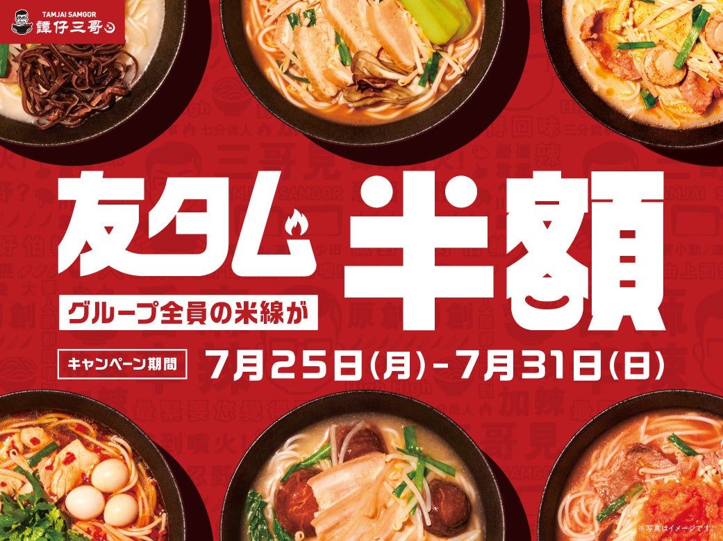 まだタムジャイサムゴーを味わったことのない方も、既にタムジャイサムゴーファン=TAMLER(タムラー)の皆様にも、ワイワイご家族・友人と一緒に新感覚の米線を味わってほしい!そんな想いから、このたび、新宿中央通り店、吉祥寺店、恵比寿店の全店にて米線半額キャンペーン「友タム」を実施いたします。