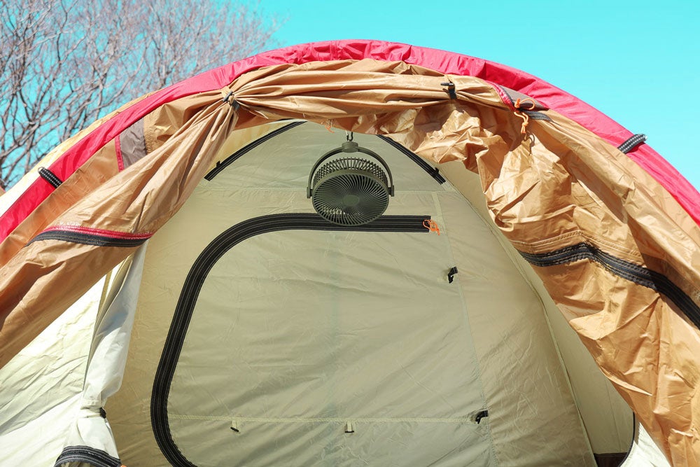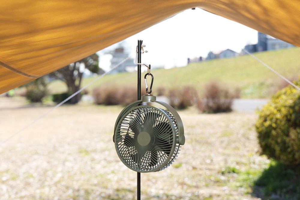 専用カラビナでテント内上部に吊り下げれば、シーリングファンのような使い方も出来ます。