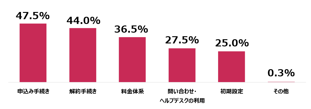 最後に、世の中は複雑や面倒と思うことが多いZ世代に向けたサービス改善のために、サービスや手続きに関してシンプルにしたいと思うことも聞いてみました。順位は以下の通りですが、「申込手続き」47.5%、「解約手続き」44.0%と、申込や解約での事務手続きを主に面倒と感じていることがわかります。スマホで何でも簡単にできる時代になっても、まだサービスや手続きをシンプルにしたいという気持ちはあるのでしょうか。