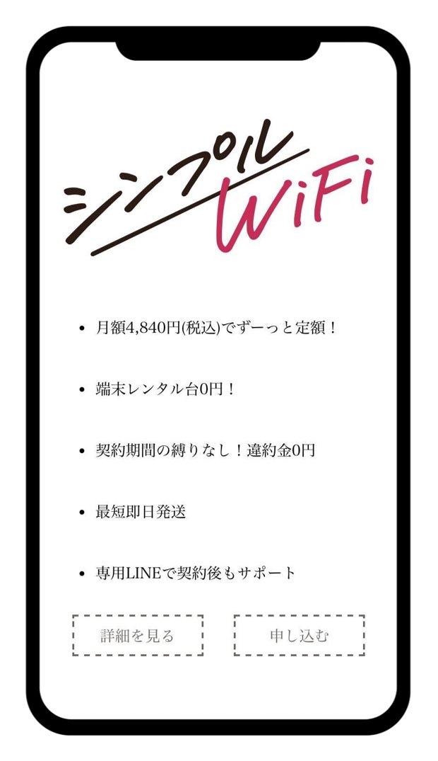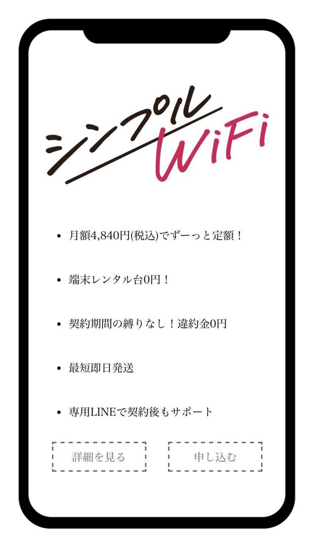 この申込ページはテキストを主体としたデザインで、表示の速さにもこだわり、シンプルで快適な通信サービス提供への想いを込めました。また、「月額4,840円でずーっと定額!」、「端末レンタル代0円!」、「契約期間の縛りなし!契約金0円!」、「最短即日発送」、「専用LINEで契約後もサポート」と、Z世代へ向けて「シンプルさ」を追求したWiFiサービスを提供します。