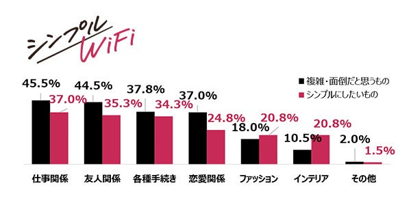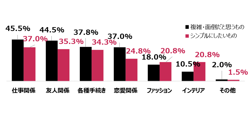 つづいて、「複雑・面倒だと思うもの」と、「シンプルにできるならしたいと思うもの」について、それぞれその内容を聞いてみたところ、「複雑・面倒だと思うもの」と、「シンプルにできるならしたいと思うもの」の上位は同じ結果に。1位「仕事関係」、2位「友人関係」、3位「各種手続き」の順になりました。仕事や友人関係といった人間関係につながることが複雑・面倒でシンプルにしたいという気持ちは分かりますが、各種手続きでも不満を感じることがあるようです。