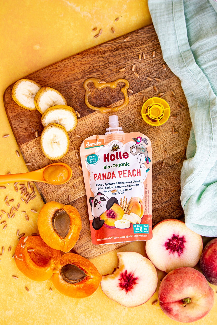 バナナ、ピーチ、アプリコットのまろやかな甘み。全粒粉のスペルト小麦のほのかか香ばしさ。なめらかなとろみで、舌触りに敏感なお子さまにもおすすめ。