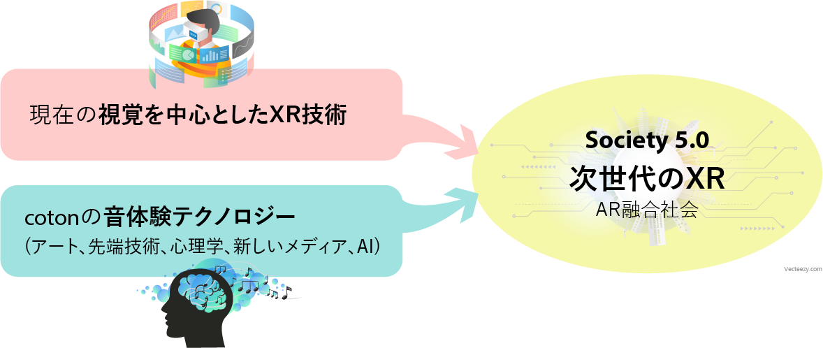 昨今のテクノロジーの発展により、来たるべきSociety5.0に向けたXRを活用する取り組みは年々拡大しています。XRの持てるポテンシャルを最大化するには視覚だけでなく、聴覚が不可欠です。cotonの音体験テクノロジーは現在、広く行われている視覚中心のXR(VR,AR)を補完、補強し、将来的にそれらと一体化して現れるだろう、あたらしい視聴覚体験環境へのファーストステップでもあります。