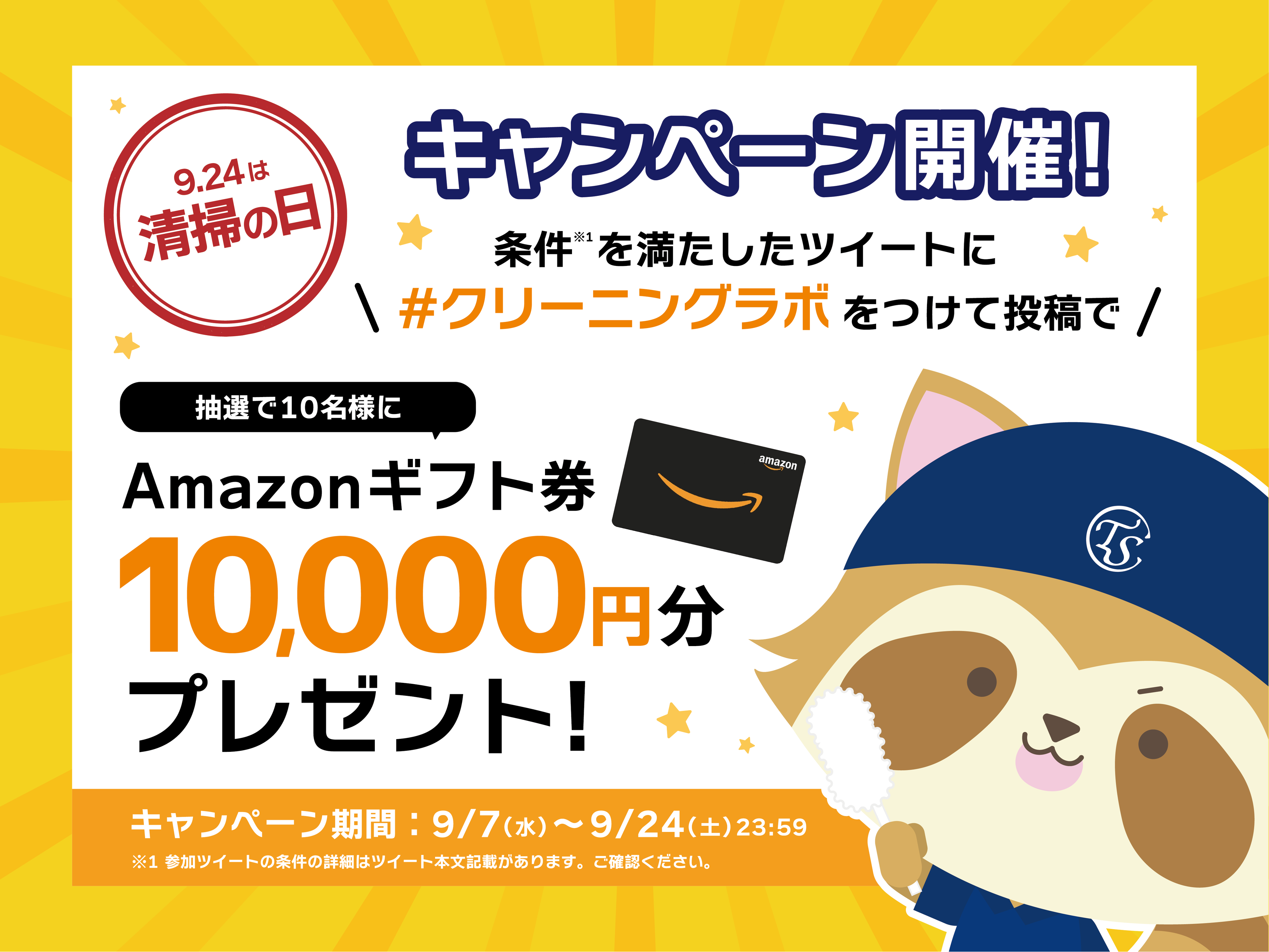 クリーニング・ラボを運営している株式会社TSC(本社:神奈川県厚木市)は、9月24日(土)までに、総額100,000円分のAmazonギフト券をプレゼントするキャンペーンを実施いたします。
