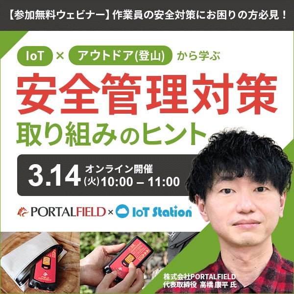 IoTプラットフォームサービス「IoT Station®」を提供する、株式会社ゼネックコミュニケーション(本社:京都市中京区、代表取締役 : 美馬芳彦) は、株式会社PORTALFIELD(本社:東京都千代田区、代表取締役:高橋康平)と、『 PORTALFIELD×IoT Station® 共同ウェビナー ~登山などのアウトドアでのアクティビティに潜む課題と解決策を徹底解説~ 』を、2023年3月14日(火)オンラインにて共催します。