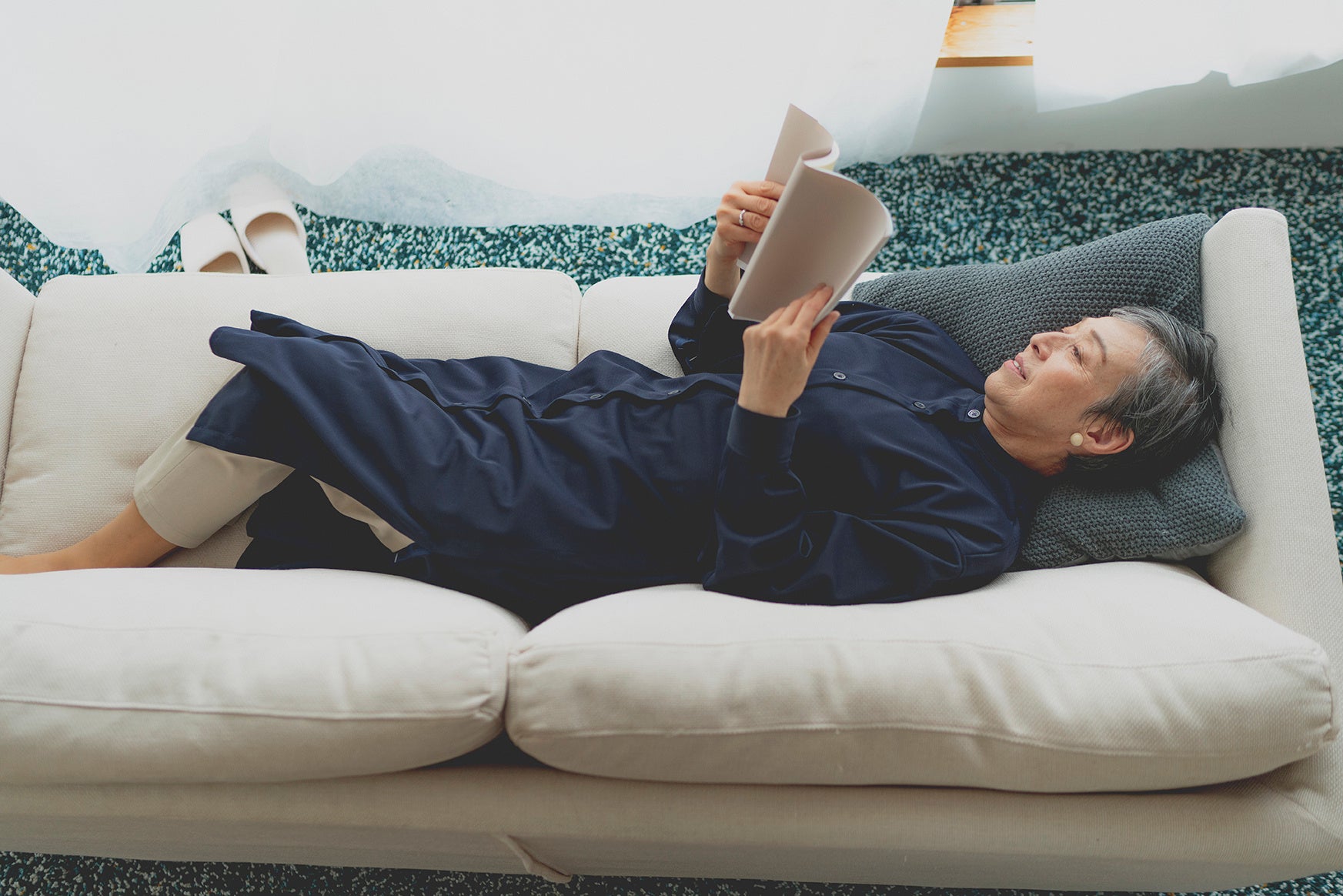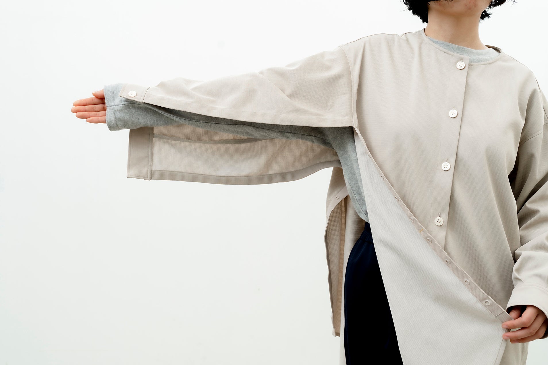 冨⼠経編のホテルリネン製品製作で培ってきた⽣産技術⼒を最⼤化すべく、ブランディングから全体のアートディレクションを監修しました。アートディレクションでは、感性の若い⾼齢者の⽅とターゲット層ではない若い⽅にも響くよう、シンプルで気持ちのよいデザインを⼼がけました。またデザインには⽼⼈福祉施設へのインタビュー内容を反映しました。たとえば、ワンピースやチュニックの前びらきのボタンは、スナップにせず、ご⾃⾝で留めていただくことで、毎⽇の⼩さなリハビリとなるように設計しています。アパレルのデザインには、TSUGIのディレクションのもと、KENJI HIKINOを率いる引野謙司⽒に参画いただき、ケアウエアとしての要件を満たした上で、ミニマルで美しいデザインをご提供いただきました。